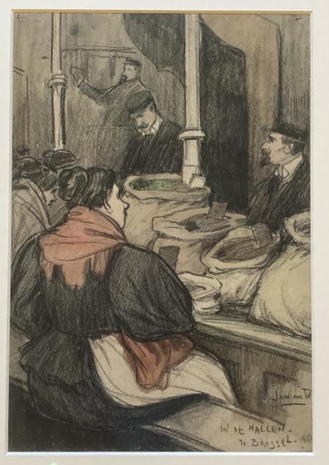 We zien een vrouw die inkopen doet op de markt. Ze zit op een bankje, voor een kraam waarop zakken handelswaar staan uitgestald. Welke producten: koffie, graan, suiker, bonen? Of misschien specerijen? Dat is niet te zien. In de zakken staan wel prijskaartjes, maar deze zijn niet te lezen. Achter de kraam zit een handelaar, netjes in uniform met een pet op zijn hoofd. Op de achtergrond zijn nog twee handelaren en ook andere klanten zichtbaar. We zijn in de Belgische hoofdstad. In de hallen te Brussel, staat in de rechteronderhoek van de tekening genoteerd. Het werk is gesigneerd - Jan de W - en ook gedateerd. 98. Dat moet 1898 zijn, het jaar waarin Jan samen met zijn goede vriend Herman Heijenbrock een studiereis naar de Borinage heeft gemaakt. Tijdens deze reis, hoogstwaarschijnlijk per trein, op weg naar de mijnstreek in het zuiden van België, hebben ze dus een tussenstop gemaakt in de hoofdstad van België. En daar, in de markthallen, heeft Jan dit tafereel vastgelegd. Stichting Herman HeijenbrockDe tekening is eigendom van de stichting Vrienden van het werk van de industrieschilder Herman Heijenbrock, kortweg: de Stichting Herman Heijenbrock. Gezien de hechte vriendschap tussen De Waardt en Heijenbrock is het niet verwonderlijk dat er tussen de nalatenschap die door de stichting wordt beheerd ook een enkele tekening van Jan de Waardt zit. En dit is een bijzondere tekening! Wat direct opvalt is de rode sjaal die de vrouw om haar nek draagt. Er zijn - voor zover mij bekend - geen andere werken waarin Jan de Waardt zo uitbundig is in zijn kleurgebruik... | ![]() Elders op deze site worden meer werken van Jan de Waardt, die hij in 1898 in België gemaakt heeft, besproken: |