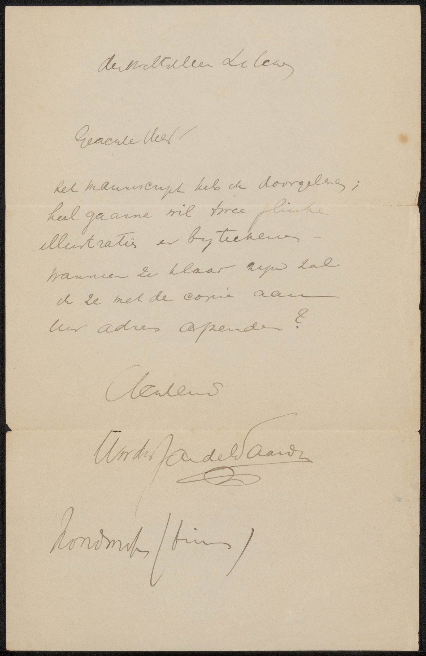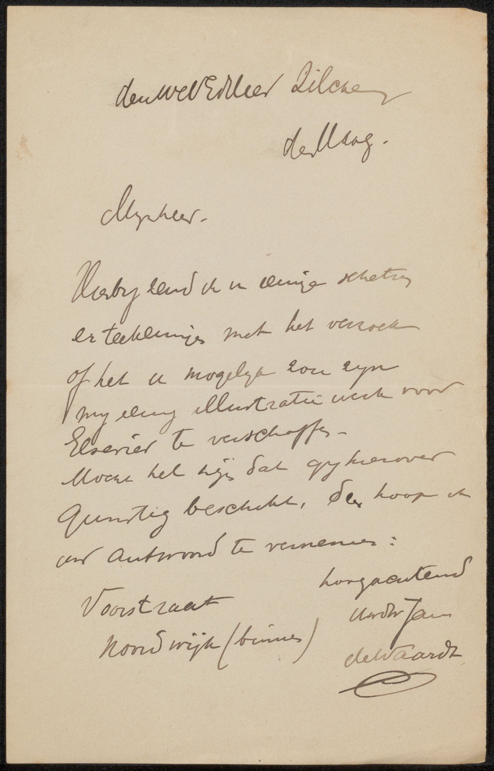 In het Rijksmuseum in Amsterdam ligt een grote stapel brieven van en aan Philip Zilcken. Zilcken (1857-1930), kunstenaar, oriëntalist en publicist, onderhield een groot netwerk. Hij correspondeerde onder andere met Elsie Maud Cownie, August Allebé, Samuel Putnam Avery, Theo van Hoytema, Jozef en Isaac Israëls en vele, vele anderen. Het museum heeft het archief met correspondentie en aantekeningen van Philip Zilcken in 1982 aangekocht. Een ware schatkamer voor kunsthistorici. En tussen deze hele stapel zitten ook enkele briefjes van De Waardt aan Zilcken. Elsevier's Geïllustreerd MaandschriftHet betreft een zakelijke briefwisseling over het aanleveren van illustraties. Zilcken is namelijk als redacteur verbonden aan Elsevier's Geïllustreerd Maandschrift. Dit tijdschrift, opgericht in 1891, heeft bijna een halve eeuw, tot aan het begin van de Tweede Wereldoorlog, een toonaangevende rol gespeeld in het Nederlandse culturele leven: veel jonge schrijvers en dichters hebben met een publicatie in de Elsevier gedebuteerd. Daarnaast werd in het blad het werk van beeldend kunstenaars en architecten besproken. Zilcken heeft de functie van redacteur bij Elsevier tien jaar bekleed, van 1896 tot 1906. De Waardt, die in 1896/1897 in Den Haag woonde, heeft Zilcken waarschijnlijk ontmoet in de kringen rond de Haagsche Kunstkring. Mogelijk heeft Zilcken, toen net begonnen bij Elsevier, hem persoonlijk uitgenodigd om eens wat werk te laten zien. Het briefje dat hiernaast is afgebeeld, is waarschijnlijk in de zomer van 1897 geschreven. Want hoewel het schrijven niet gedateerd is, zien we onderaan de brief het adres van de afzender staan: Voorstraat, Noordwijk (binnen). En we weten dat Jan de Waardt in het voorjaar van 1897 - vanuit Den Haag - naar Noordwijk is verhuist. ![]() | ![]() De Waardt schrijft: "Hierbij zend ik u eenige schetsen en teekeningen met het verzoek of het u mogelijk zou zijn mij eenig illustratiewerk voor Elsevier te verschaffen." Welke schetsen en tekeningen als bijlage bij dit briefje gevoegd waren is helaas onbekend... Maar het antwoord van Zilcken is positief: Jan de Waardt krijgt per omgaande een manuscript toegezonden. En De Waardt schrijft terug, nadat hij het verhaal gelezen heeft, dat hij hier heel gaarne twee flinke illustraties bij wil tekenen. Het betreft hier hoogstwaarschijnlijk een concept van het verhaal "EEN UIT HET ARMENHUIS" van de jonge schrijfster Truida Kok (1869-1949). Want dit verhaal verschijnt in 1898 in Elsevier - met twee grote tekeningen van Jan de Waardt erbij. Later, in 1899, schrijft Jan de Waardt nogmaals enkele briefjes aan Philip Zilcken, nu vanuit Blaricum. Het gaat dan over de illustraties die hij gemaakt heeft bij het verhaal 't Kedoo (het cadeau) van S.G. van der Vijgh jr. (1876-1899). Dit verhaal zal overigens pas in 1901 in Elsevier gepubliceerd worden. |